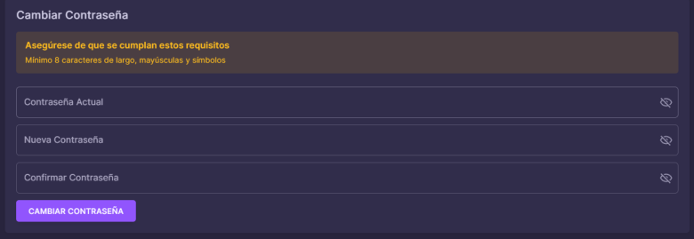 - Contraseña Actual: Debe contener al menos 8 caracteres, una mayúscula y una minúscula. Si no recuerda su contraseña, diríjase al Módulo de Autenticación para recuperarla.
