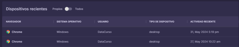 Muestra una lista de los dispositivos desde los cuales se ha accedido recientemente a la plataforma. Para visualizar los registros de ingreso de todos los usuarios de su organización: Haga clic en el selector para cambiar al modo de “Todos”.