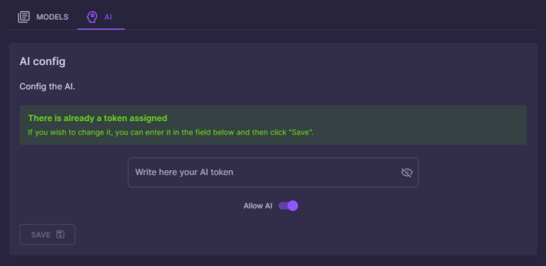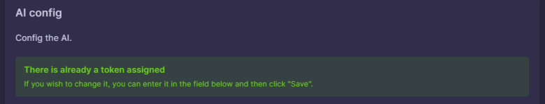 - Permite cambiar el token de IA o asignar uno nuevo si no está previamente asignado. Es responsabilidad del usuario proporcionar un token válido compatible con OpenAI. Para más información, consulte la página oficial de OpenAI: [1].