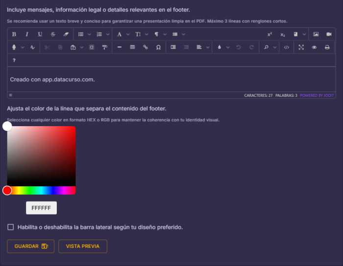 En esta sección se explican las distintas configuraciones disponibles. Para guardar la personalización y descargar el archivo de vista previa, es necesario completar todos los campos.