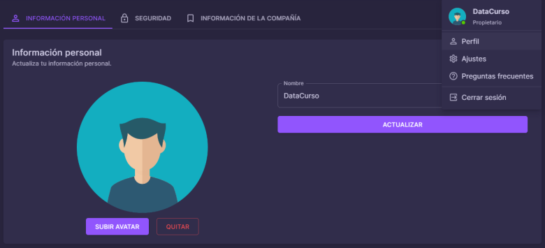 Esta opción permite al usuario editar su nombre y actualizar su avatar o foto de perfil, facilitando la personalización de su perfil en la plataforma.