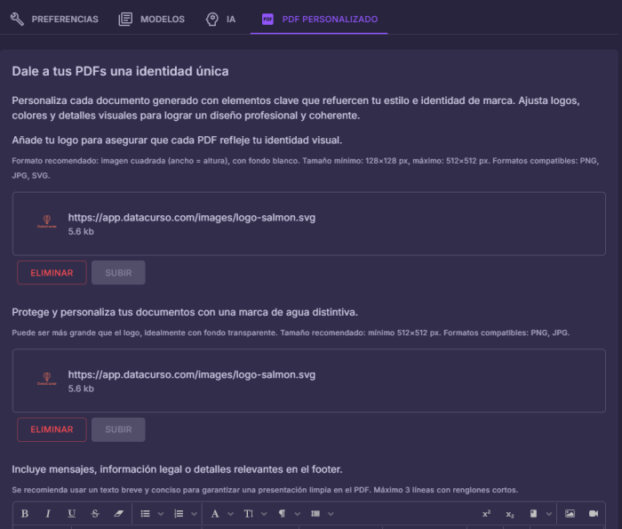 Esta sección permite a los usuarios con rol de propietario personalizar el PDF generado por los cursos en todos los modelos, creando una versión unificada para toda la organización.