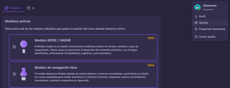 Esta opción permite seleccionar y configurar los modelos pedagógicos que estarán disponibles para uso en toda la organización. Afecta tanto la creación de cursos como el desarrollo de nuevos modelos.